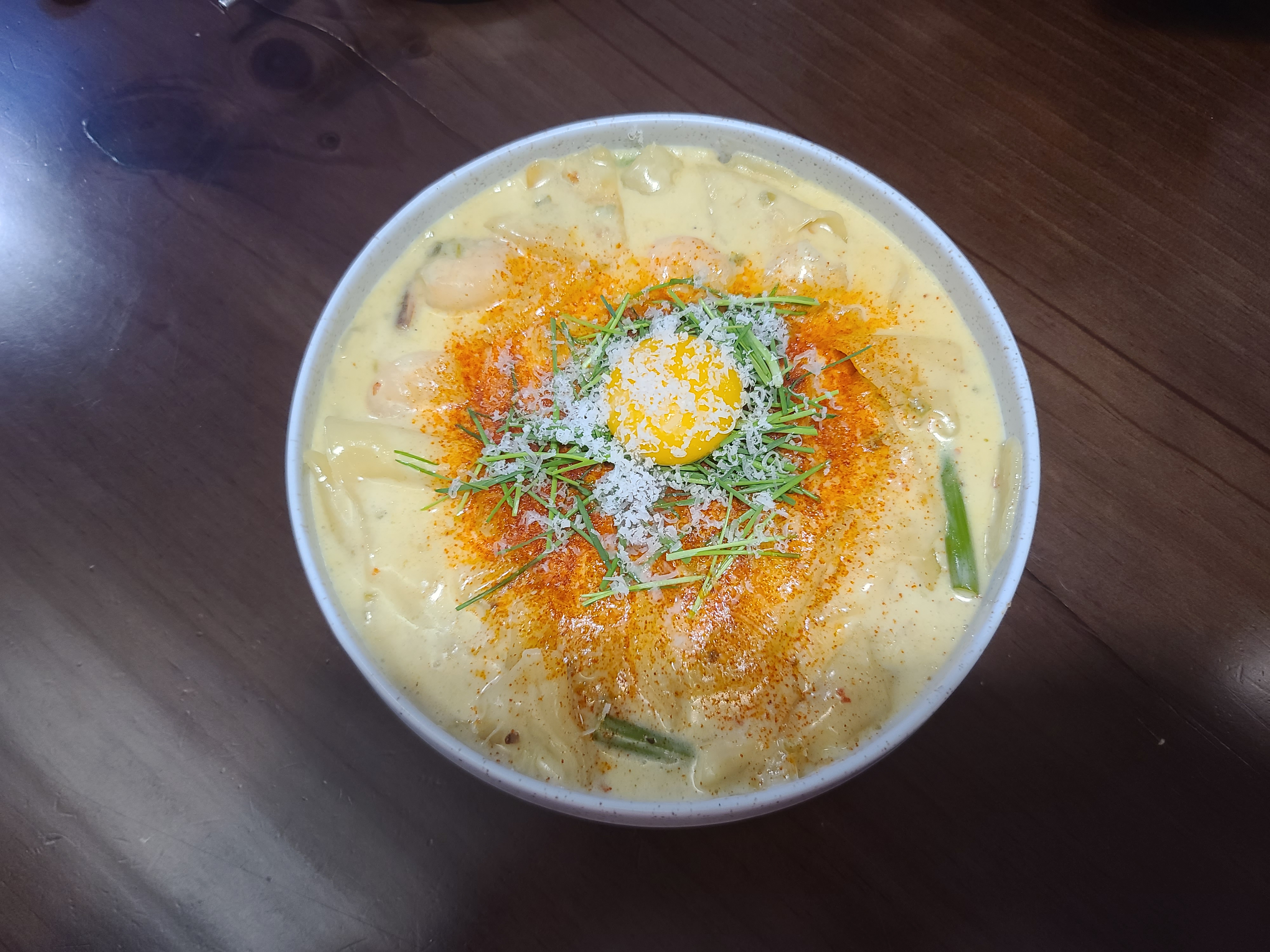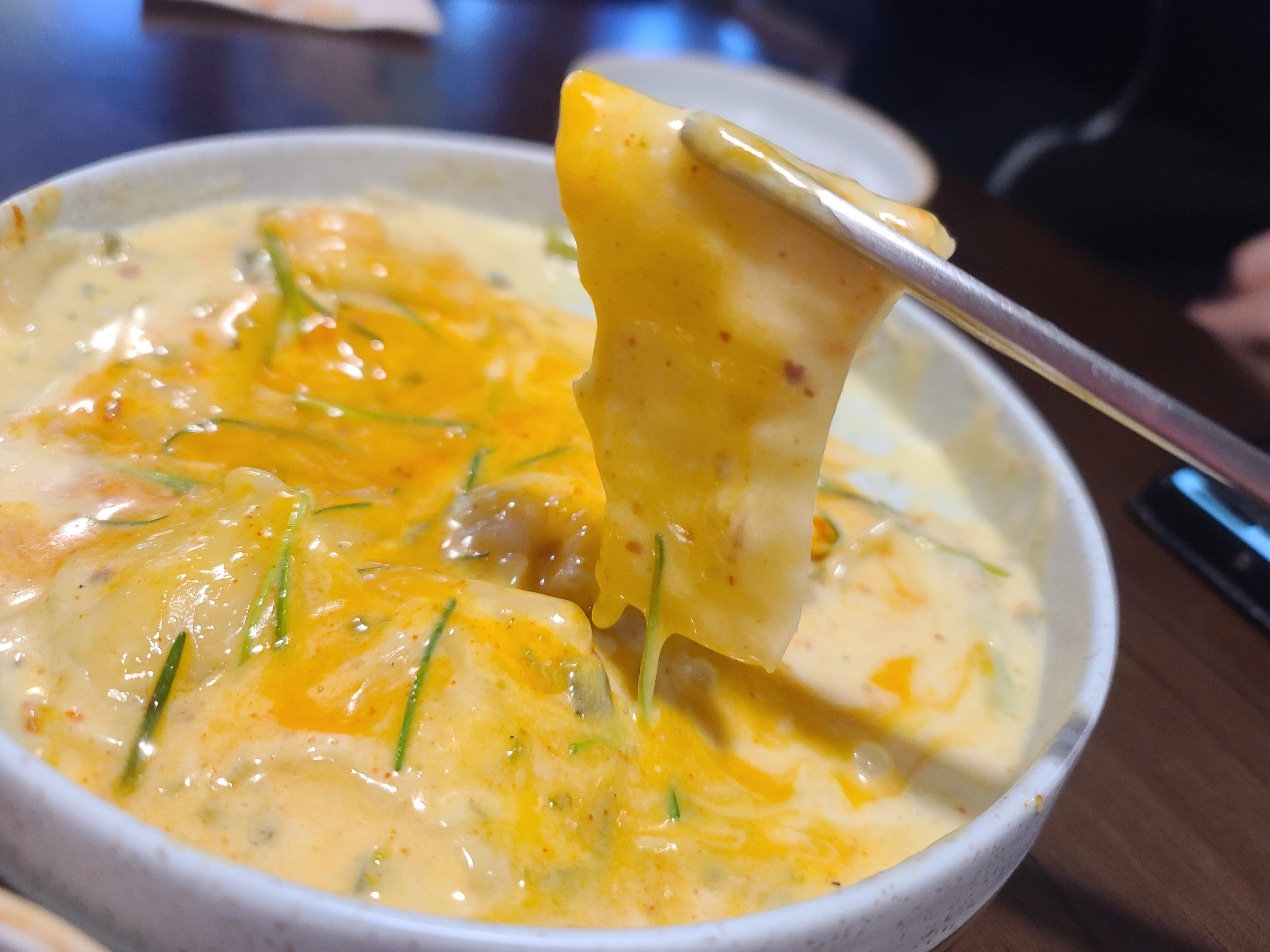 두번째 메뉴인 크림 수제비가 나왔습니다. 크림소스 위에 계란 노른자와 치즈가루, 영양부추, 안에는 수제비와 마늘쫑이 있는데 저는 마늘쫑이 참 맛있더라고요~ 저 위에 빨간 가루가 매콤해서 느끼함을 잡아줍니다.