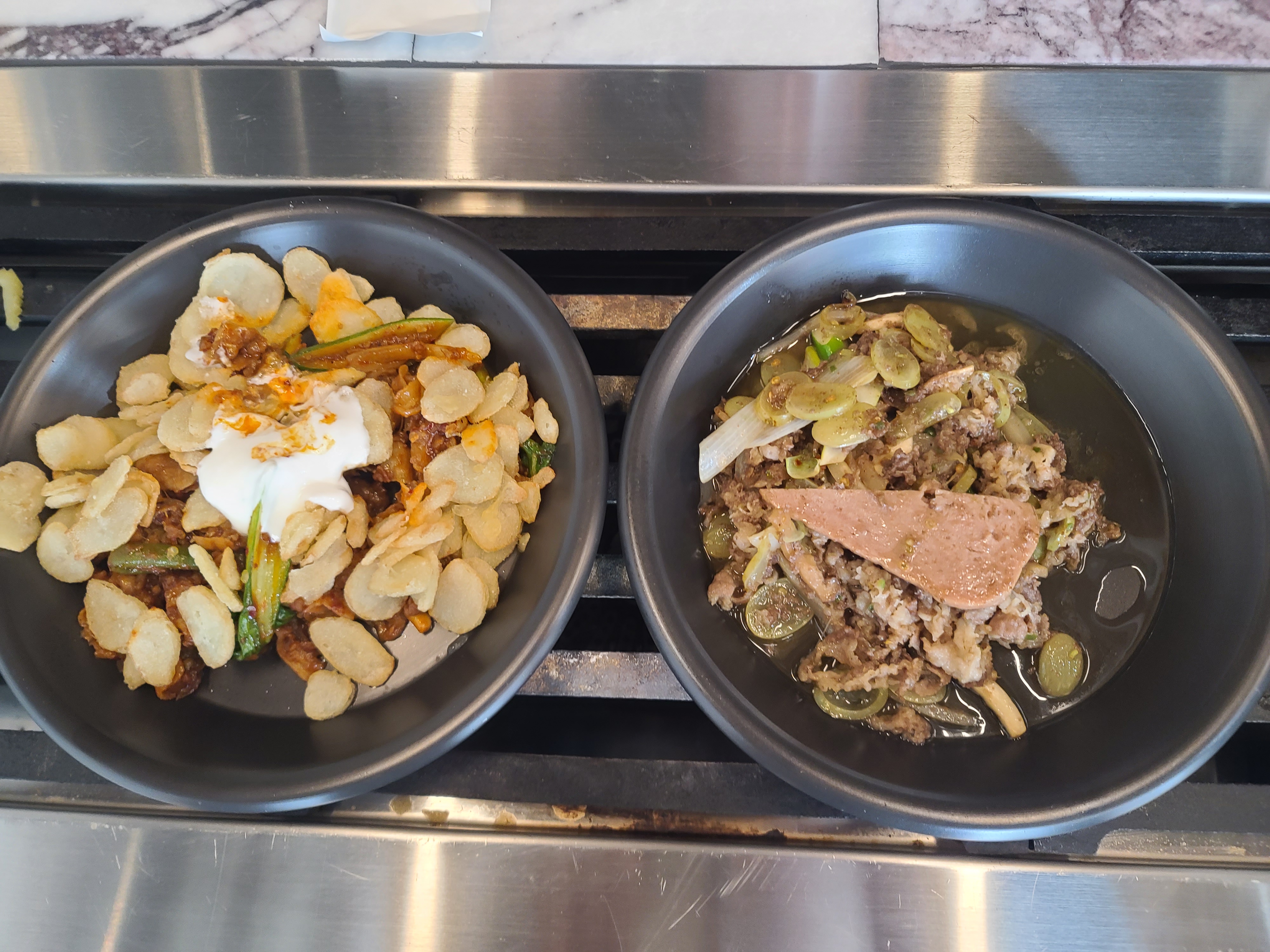 냄새가 아주 좋네요~ 라면, 김치, 베이컨, 수제햄, 마카로니, 미나리, 돼지고기 등등 다양하게 들어간 부대찌개입니다.