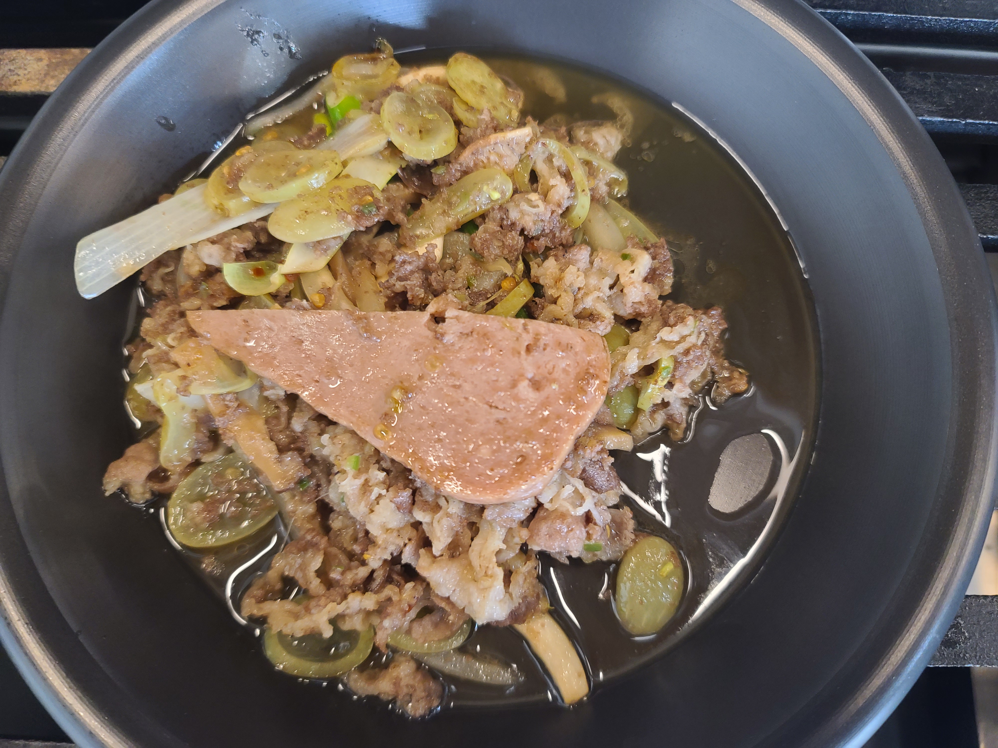 부대찌개에 이런 비주얼은 처음 보았습니다. 탑처럼 모든 재료들이 올라가 있네요
