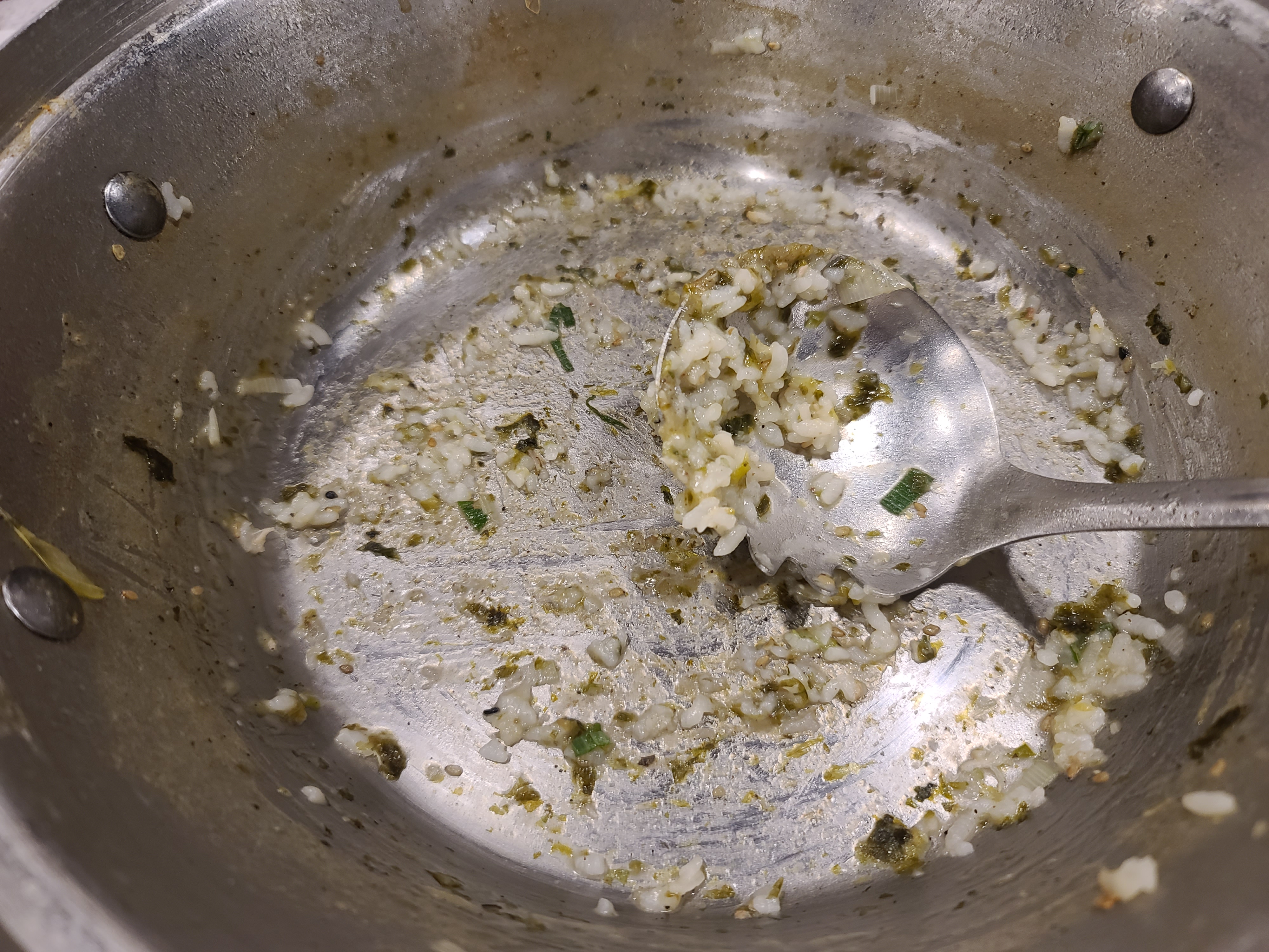 참기름과 참깨가 뿌려진 밥을 남은 육수에 넣고 끓이면 죽이 된다.