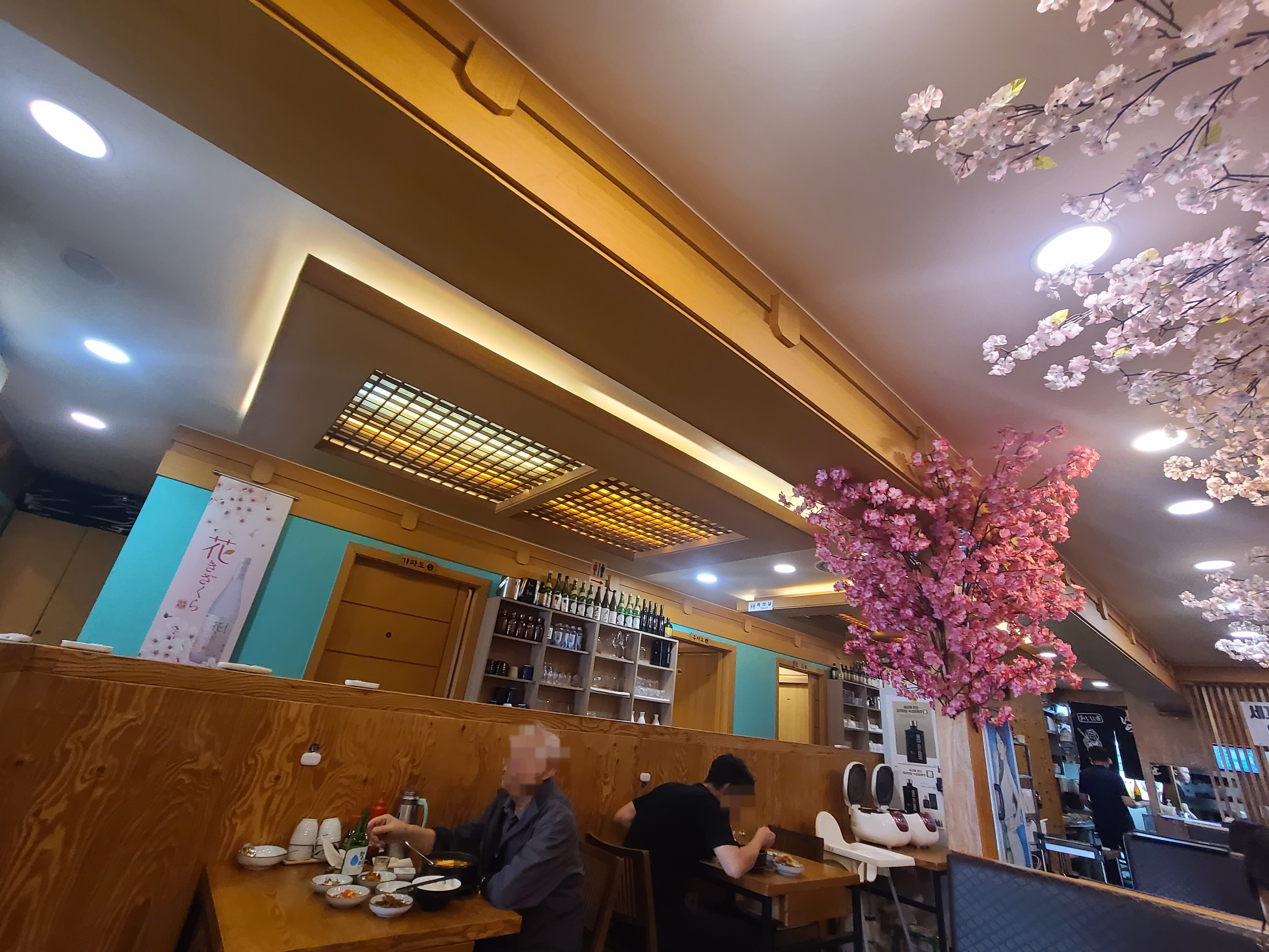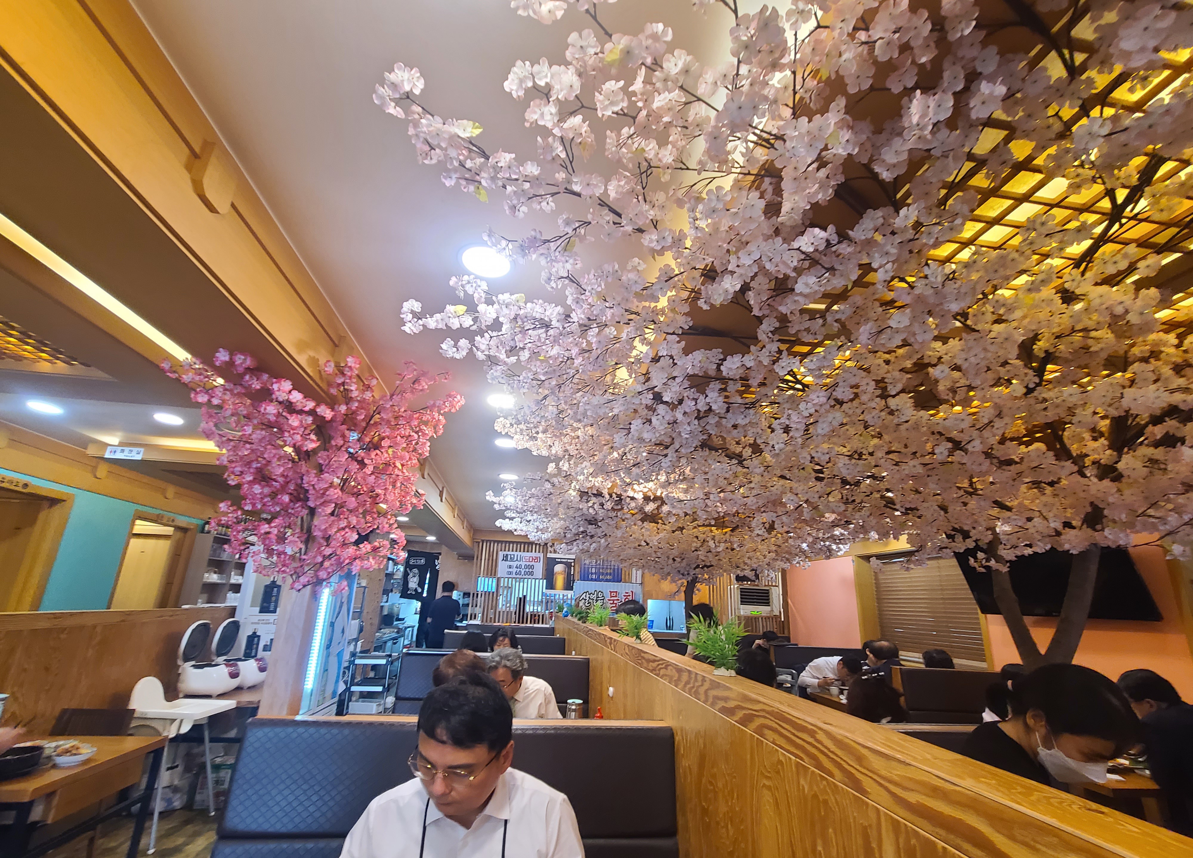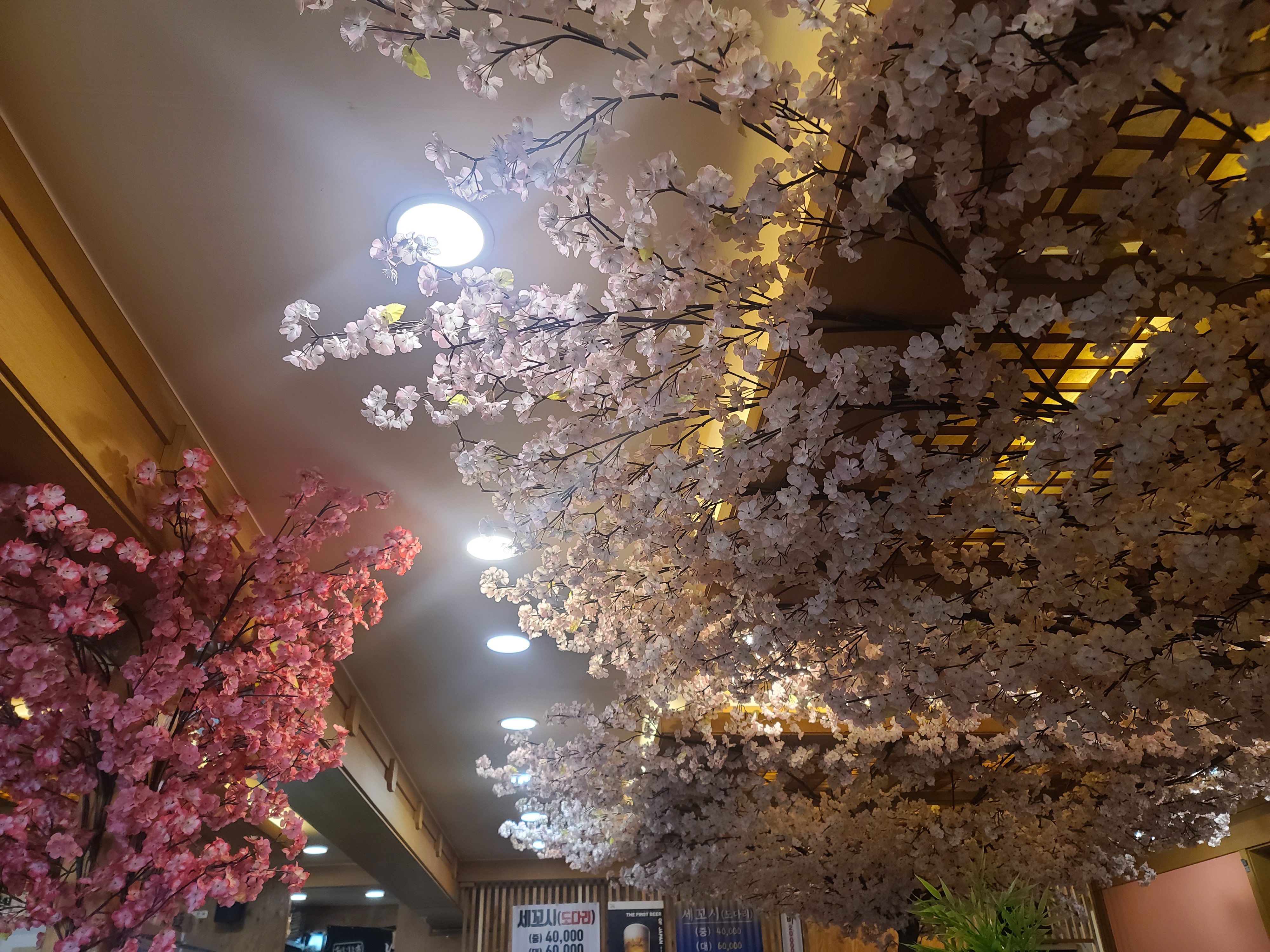 식당 천정에 벚꽃으로 인테리어를 했어요