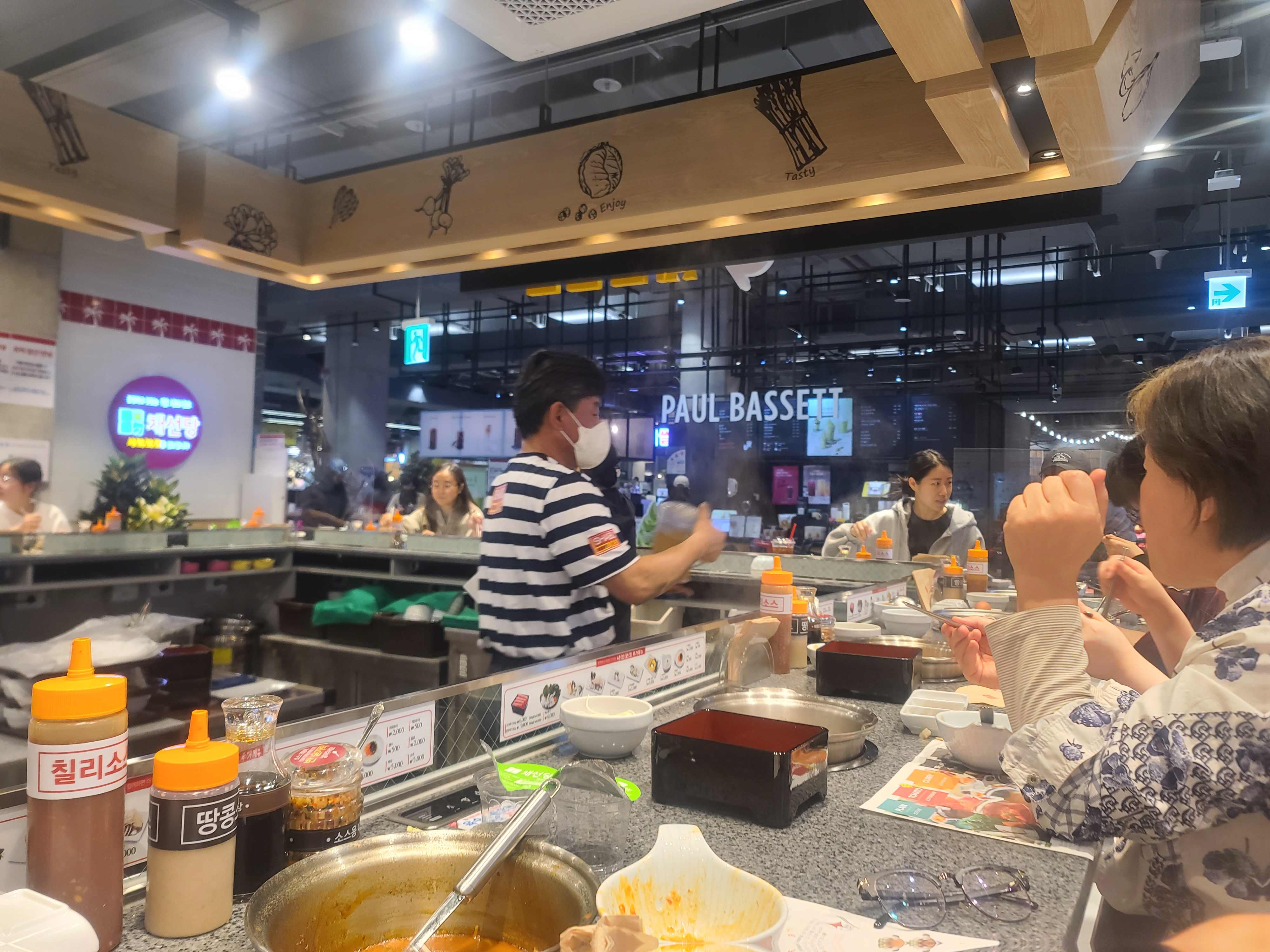 벽면에 초록, 빨강, 노랑, 보라 등 육수 광고가 있는데 종류별로 어떤 맛일까 궁금해지네요.