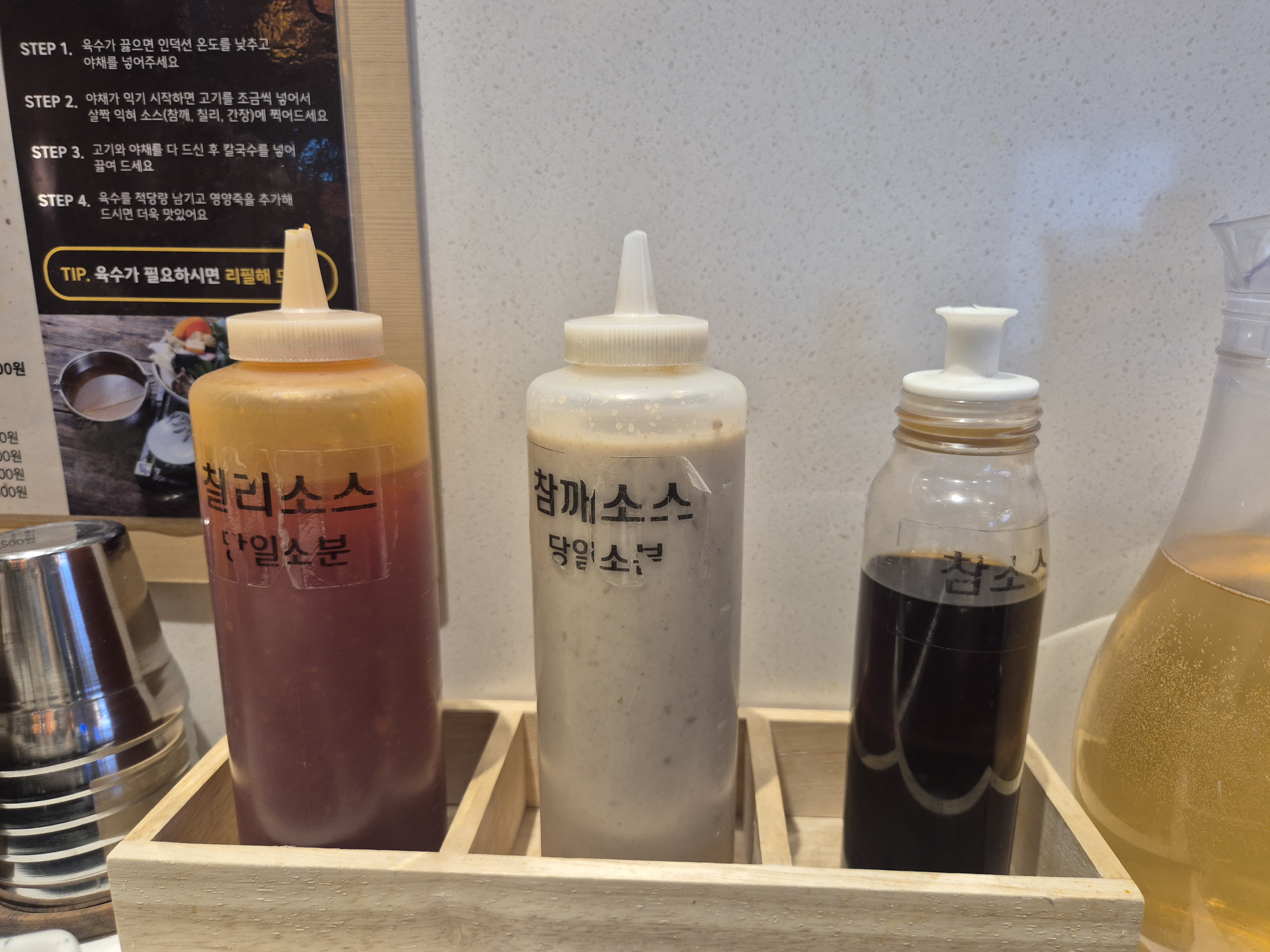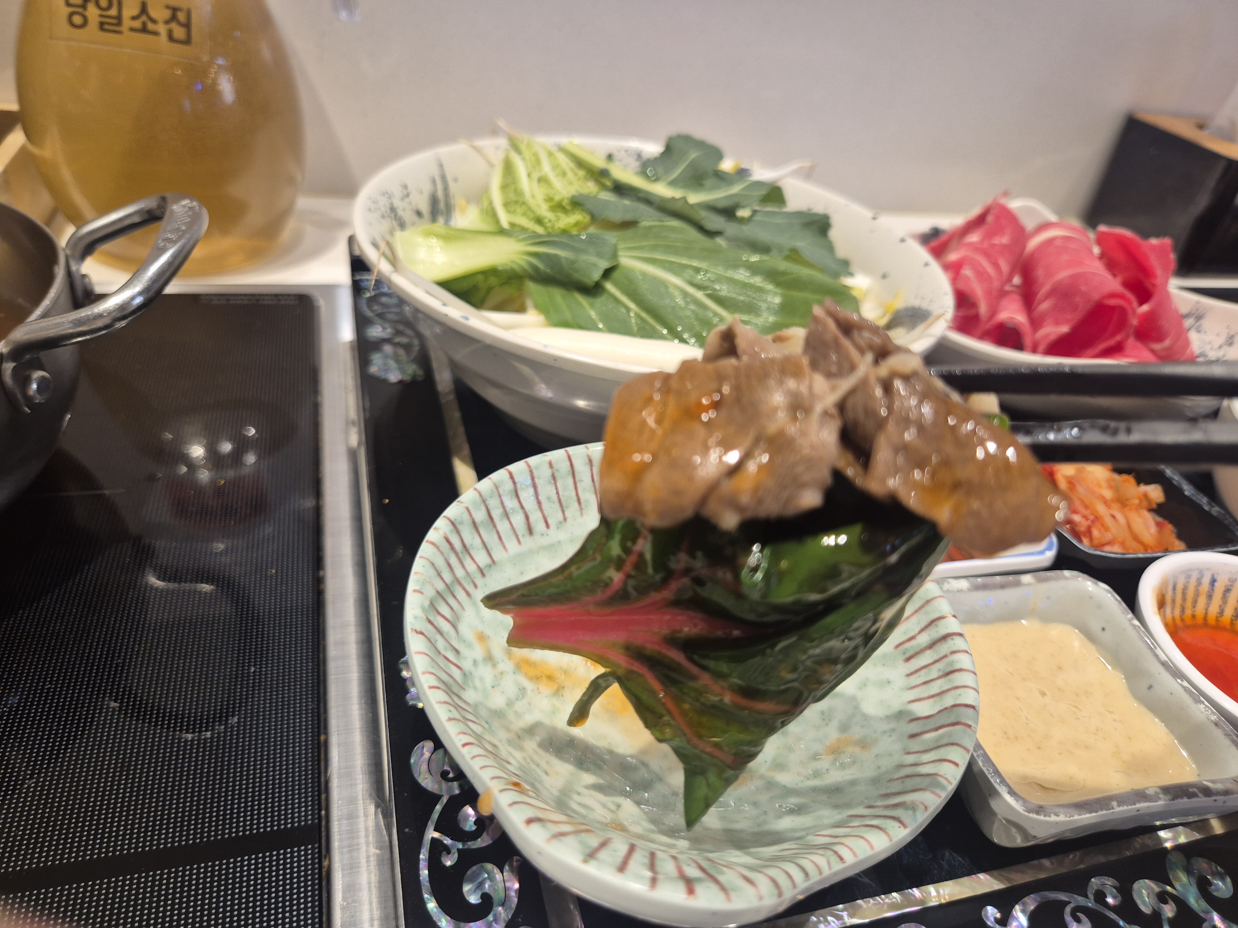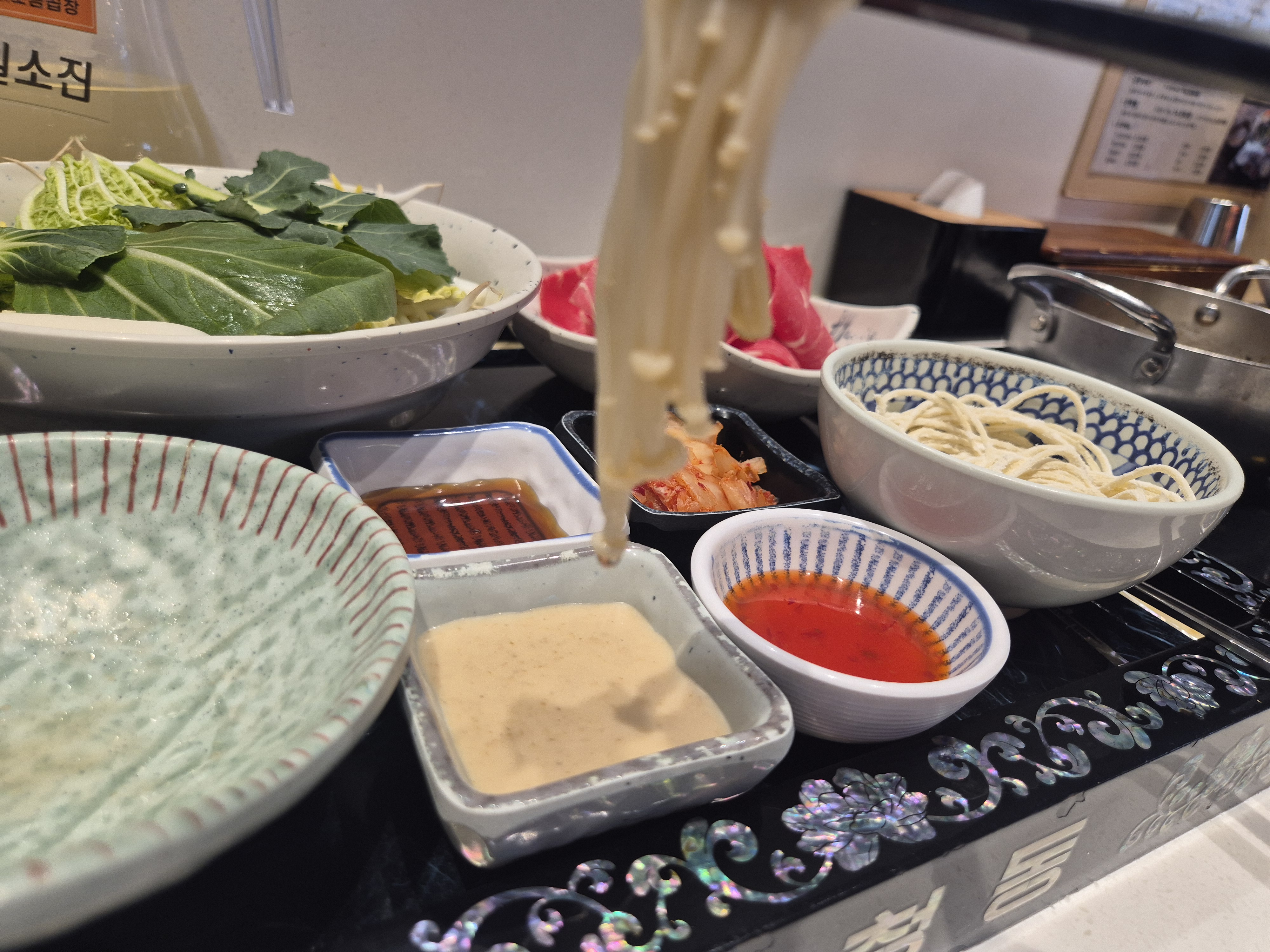 고기를 한점씩 데쳐 소스에 찍어 먹어요.