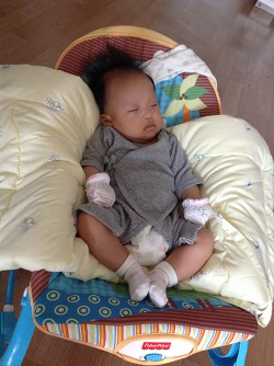 글고 되도록이면 바운서에서 잠들면 침대로 옮겨주고 했습니다. ㅋㅋ