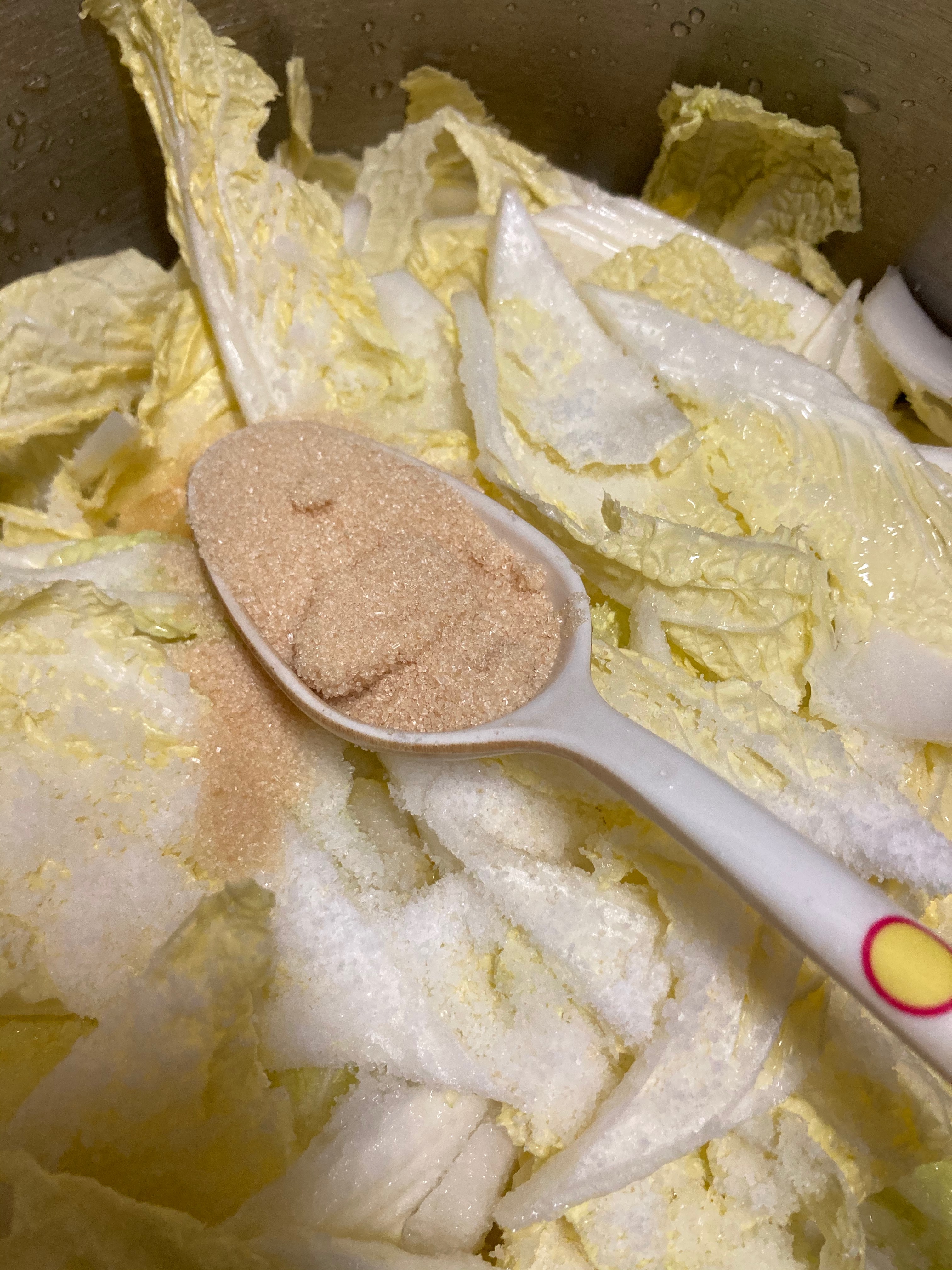 1. 배추 썰어 절이기 (소금+설탕) 30분, 절여졌으면 물기 쏙 빼주세요~