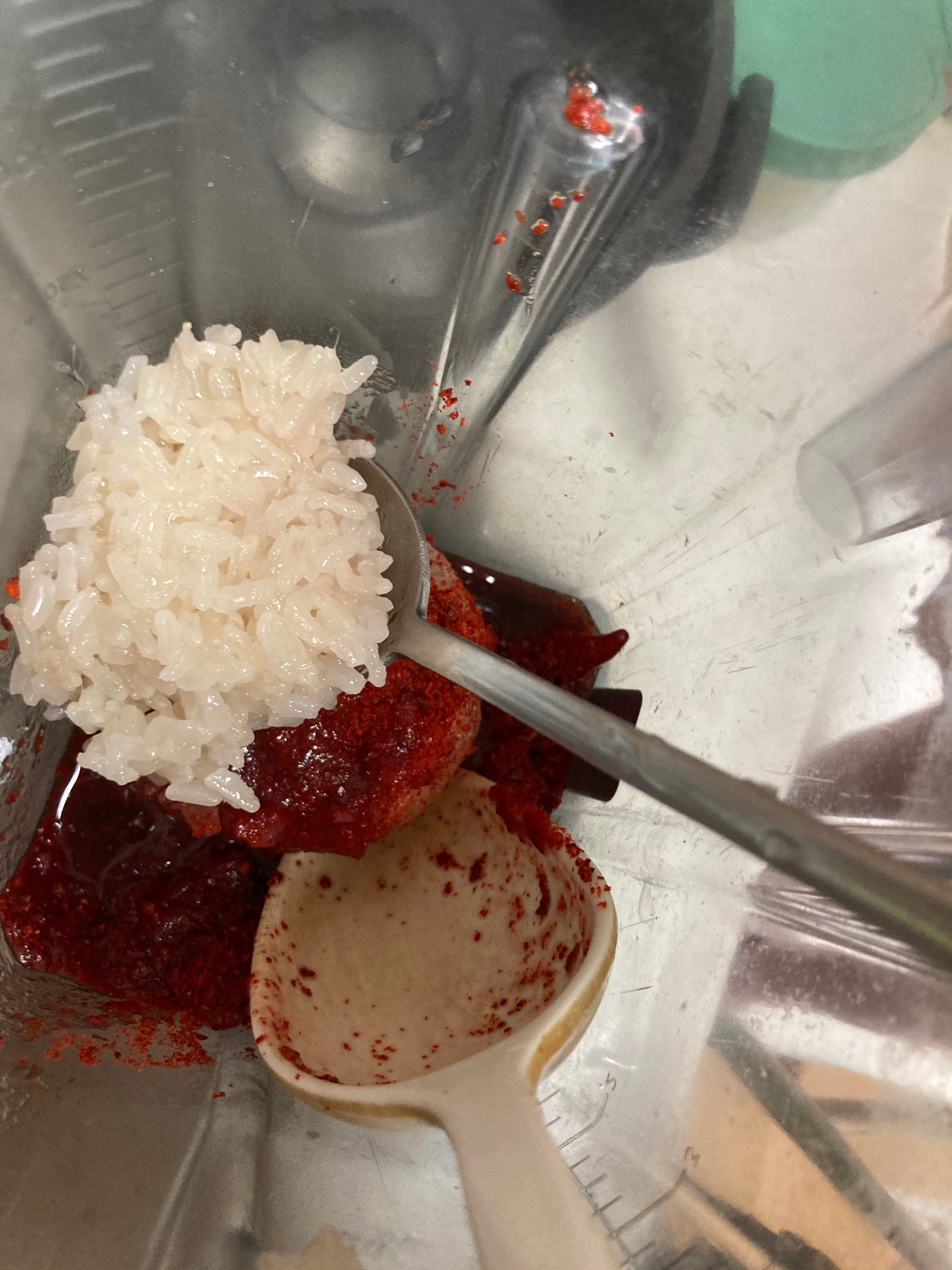 마늘 제외하고 모든 양념을 믹서기에 갈아줍니다. 이때 집에 있는 밥을 한숟가락 크게 넣어주세요 ^^