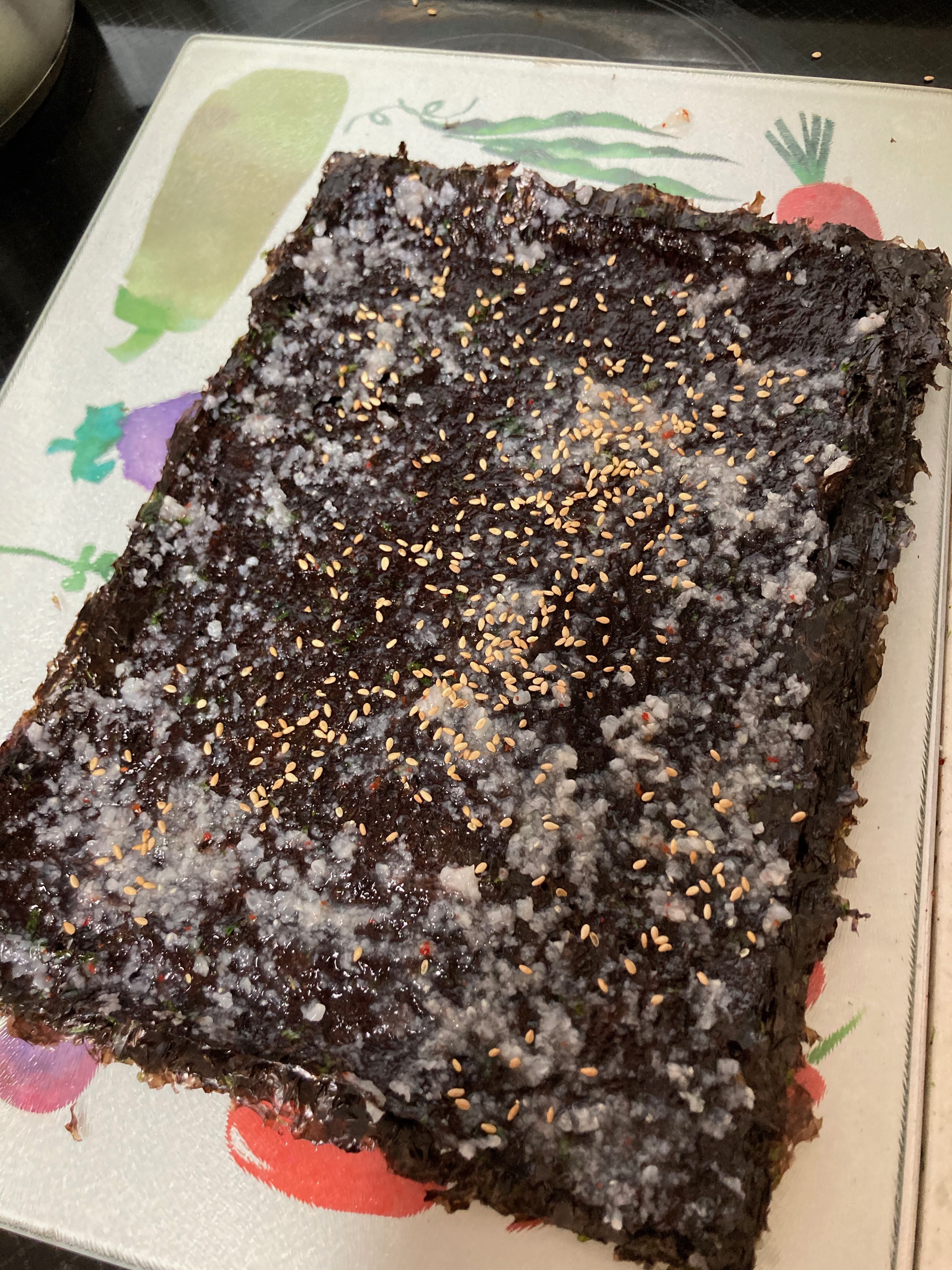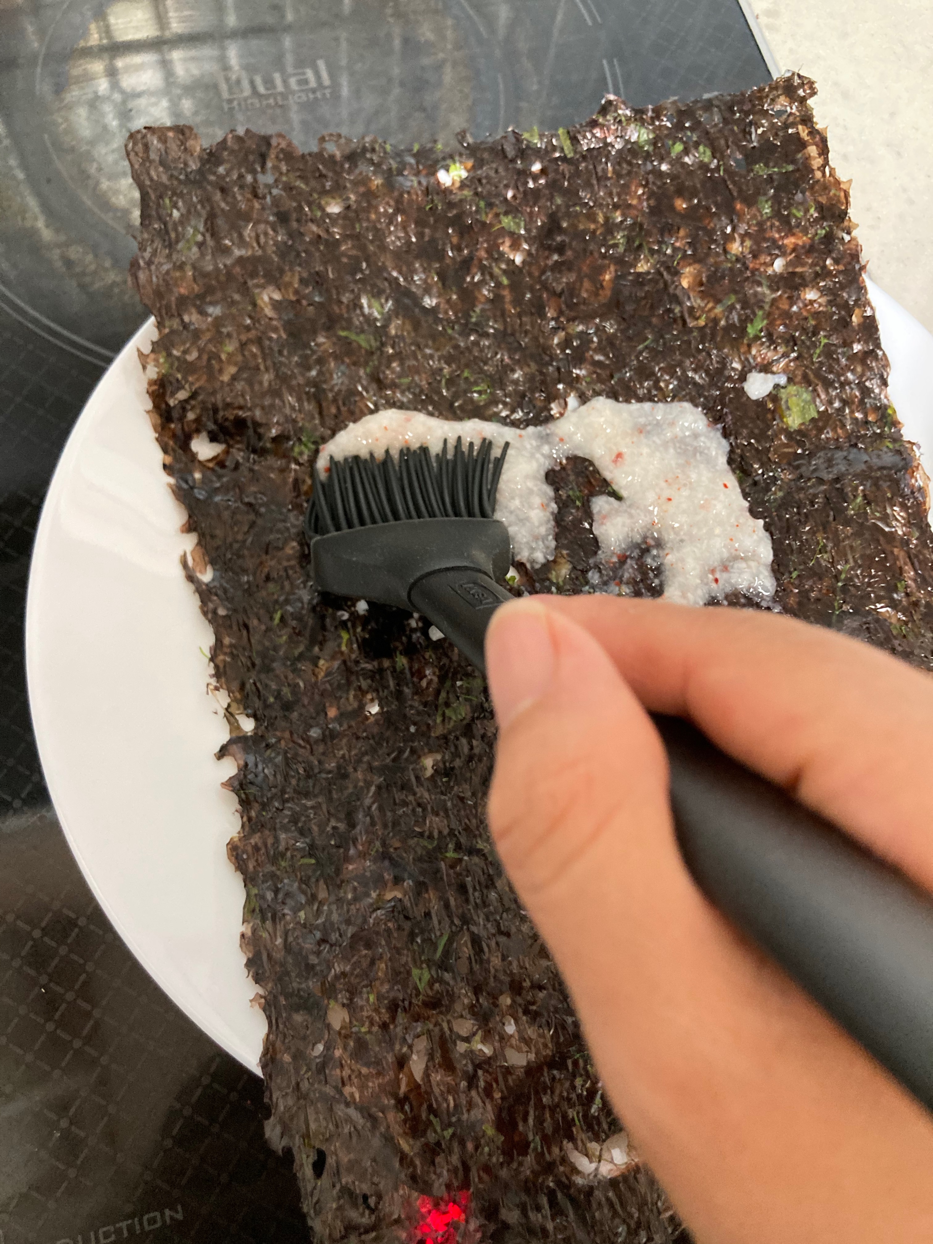 2. 김에 찹쌀풀 바르고 통깨 뿌려줌