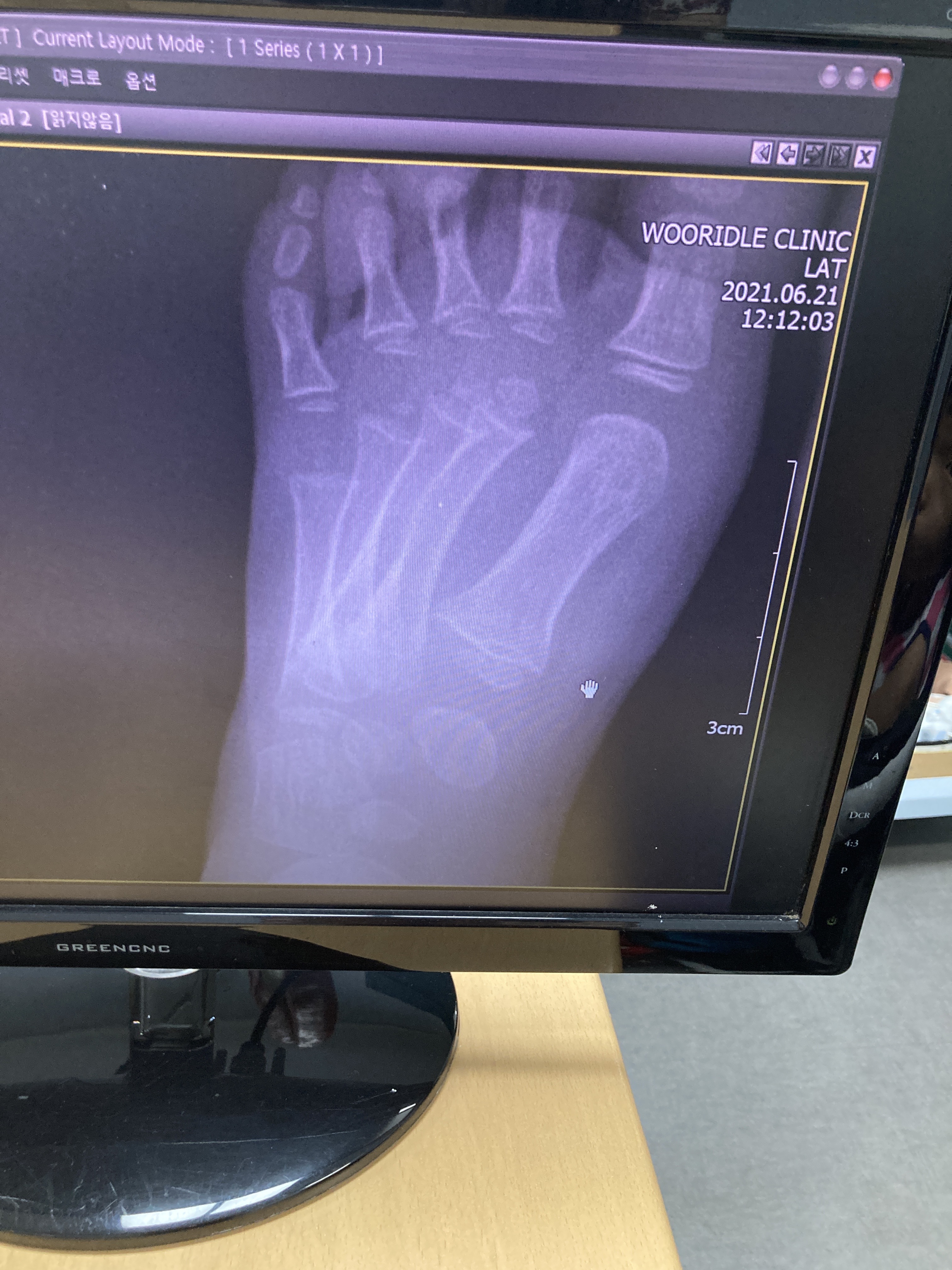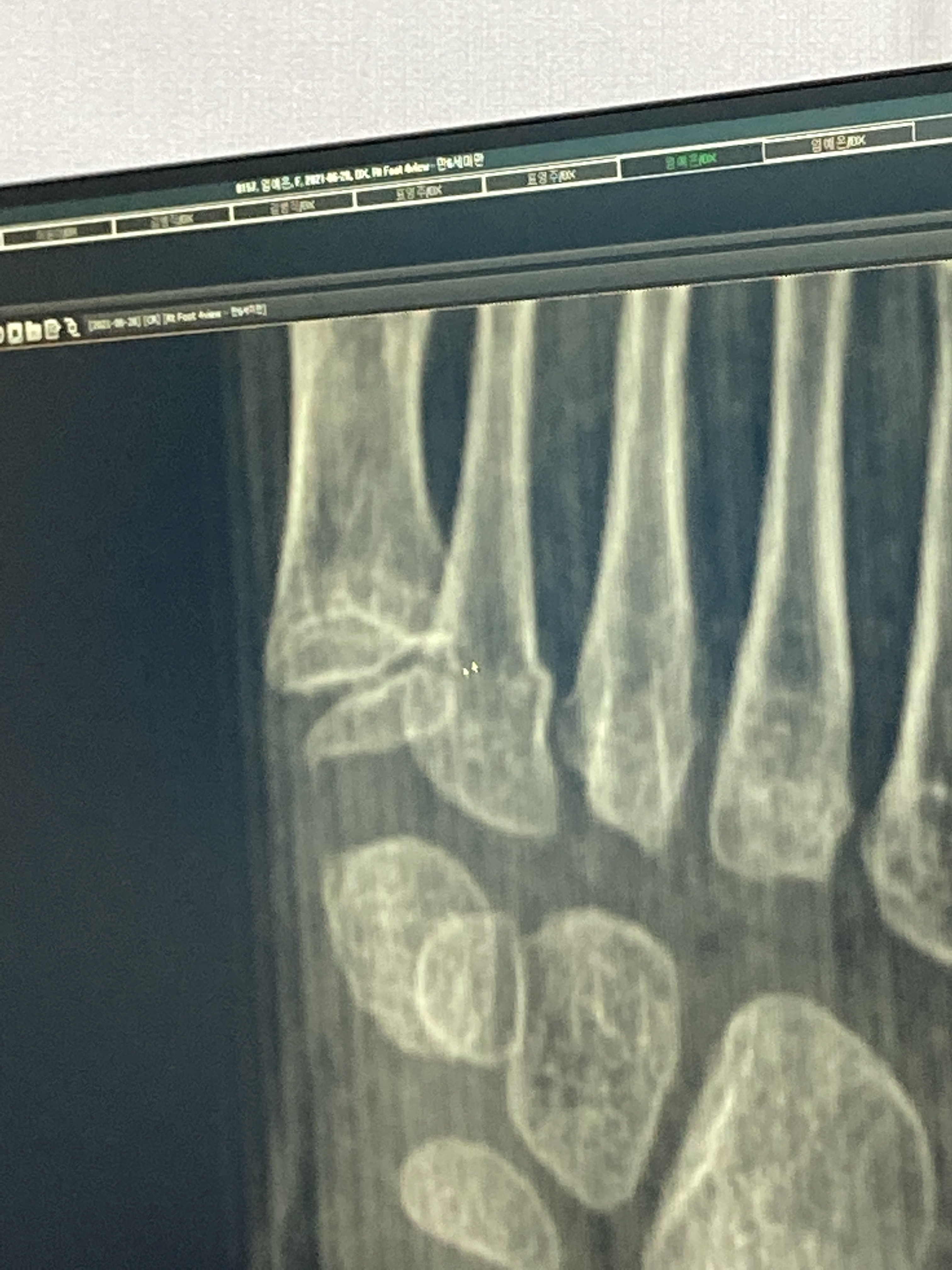 오른발, 왼발 뼈 모양이 다르다고 하시며,,, 성장판 다쳤을 가능성이 크다고,,,