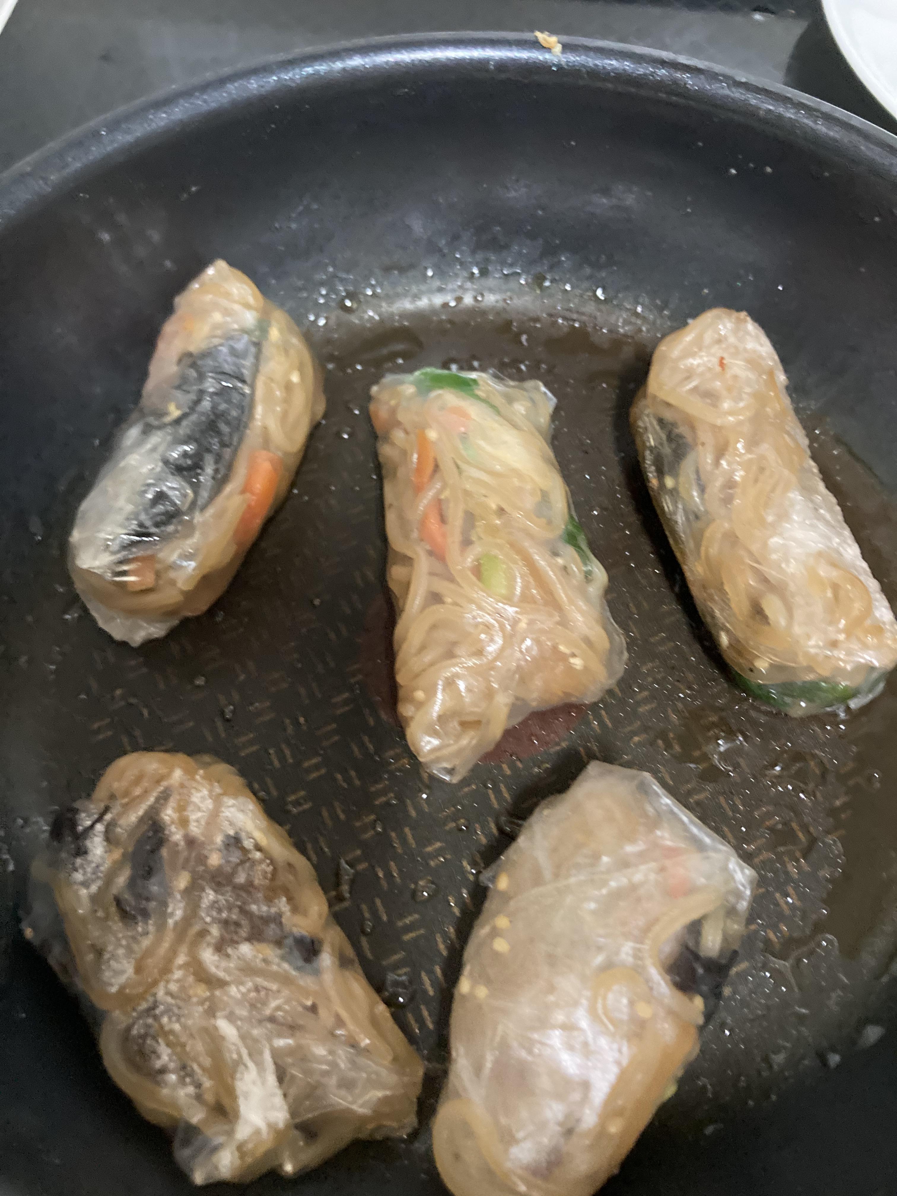 중약불로 달군 팬에 기름을 아주 살짝 두르고 말아놓은 잡채를 앞뒤로 노릇하게 구워줍니다.