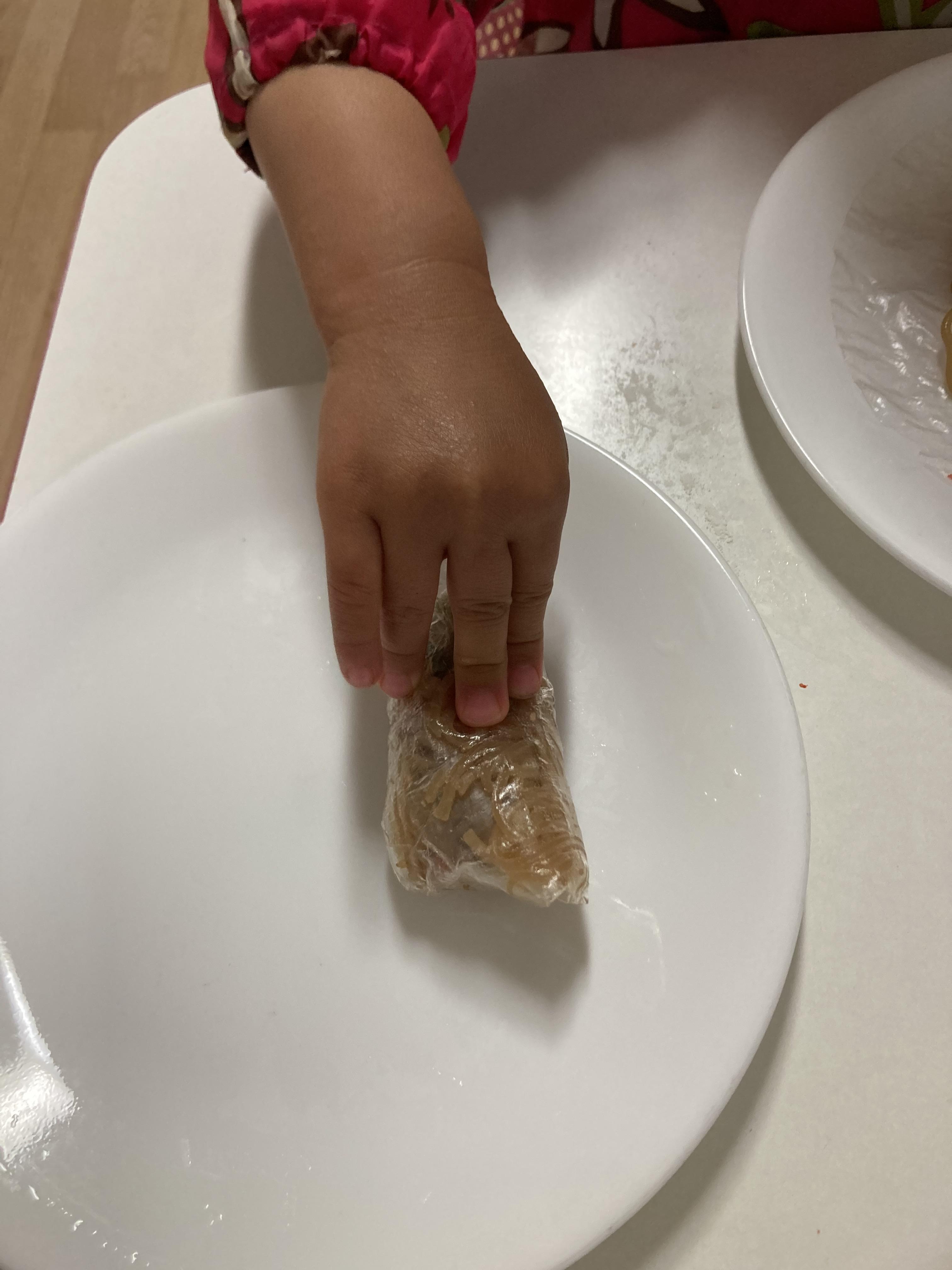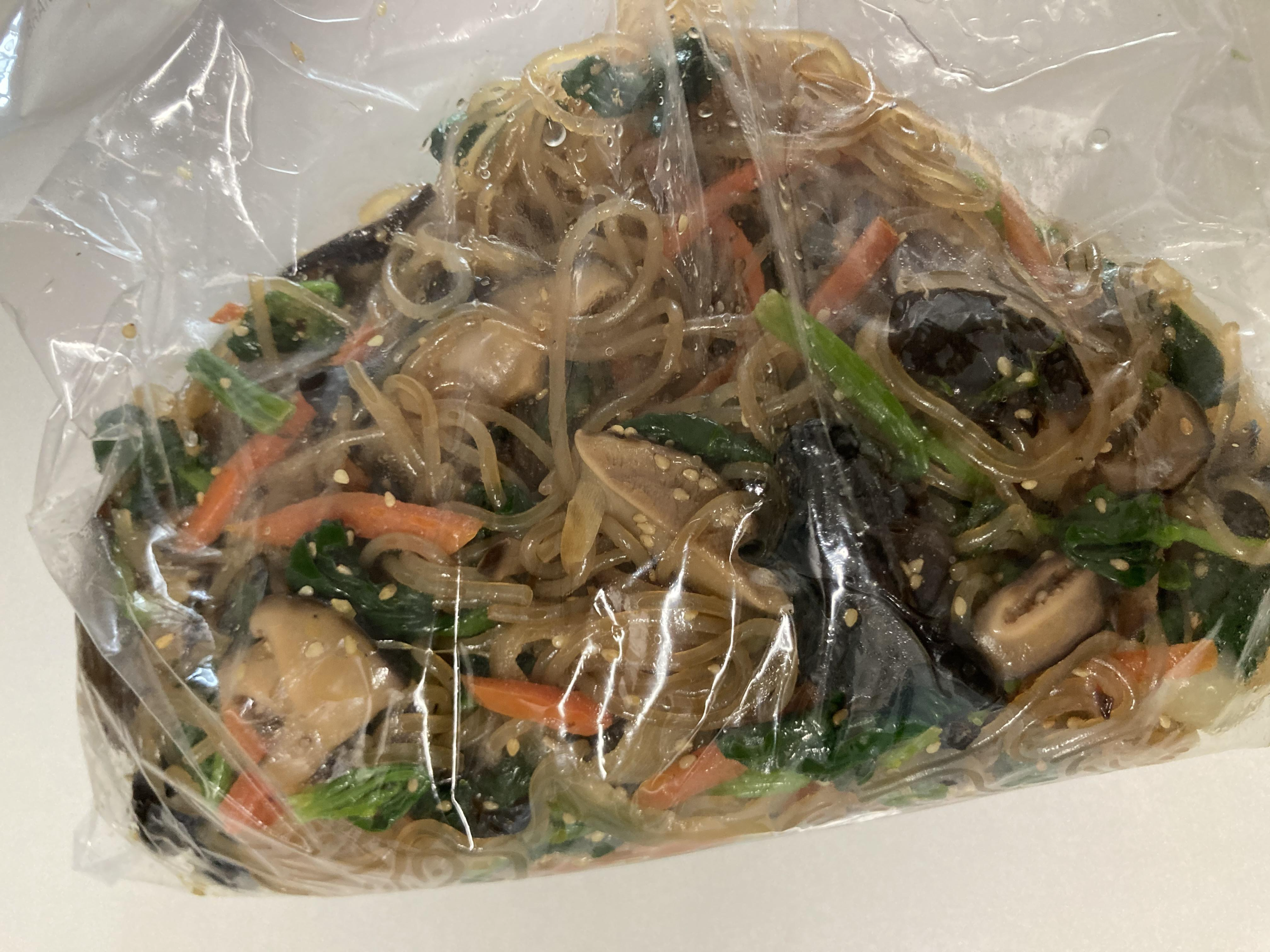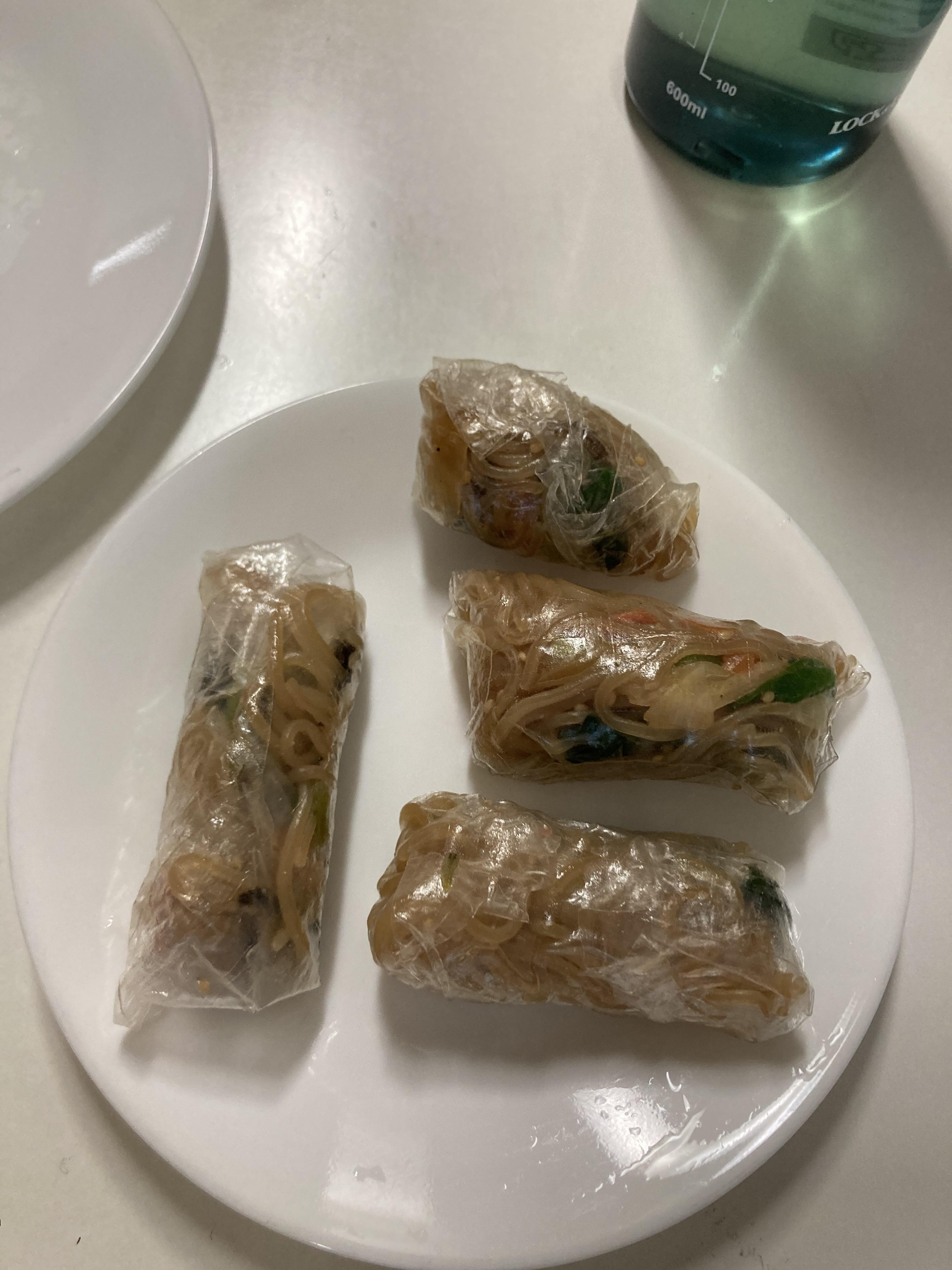 라이스페이퍼 중앙에 적당량의 잡채를 올리고, 돌돌 말아줍니다.